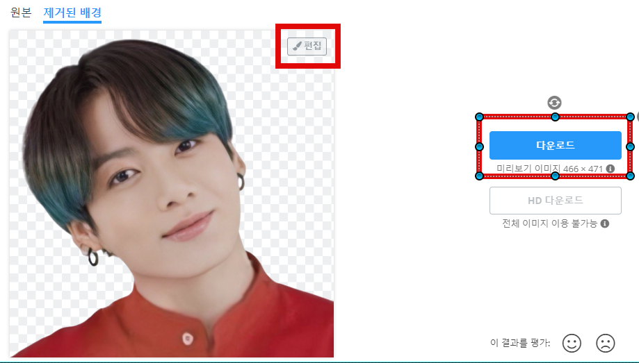 화면이 바뀌면서 수 초 후면 아래와 같이 배경이 제거가 됩니다. 이때 우측 <다운로드> 버튼을 클릭해 바로 다운 받아 사용할 수 있고, 깔끔하게 배경이 제거되었는지 확인하고 싶거나, 수정할 부분이 있다고 생각되면 좌측 <편집> 버튼을 누릅니다. 내가 원하는 배경으로도 변경이 가능하니 <편집>버튼을 눌러보세요.