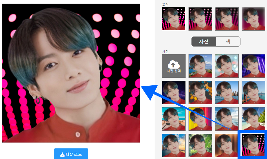 배경을 지워서 무지 바탕에 올려 사용할 수도 있지만, remove사이트에서 제공하는 배경 이미지를 이용해 배경을 교체할 수도 있습니다. 우측상단의 <배경> 탭을 눌러 여러 배경 중, 마음에 드는 것을 골라 클릭하면 위와 같이 자동으로 배경이 교체가 됩니다. 더 놀라운 것은 <사진 선택>을 눌러 내가 가지고 있는 배경 사진을 업로드하면 그 사진을 배경으로 사용할 수도 있습니다. 작업이 끝났으면 완성 사진 아래의 다운로드를 눌러 저장해주시면 됩니다. 참 쉽죠? 그동안 금손이들의 배경 지우기 스킬이 부럽기만 했는데 이제는 곰손인 나도 5초면 배경 지우기가 가능하고, 10초면 내가 원하는 배경으로 교체할 수도 있습니다. 배경지우기 스트레스에서 해방입니다! ㅋㅋㅋ