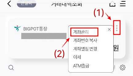 2. 다음과 같은 거래내역조회 화면이 뜨면 (1) 점 3개 부분을 누름 > 게좌관리부터 5가지의 메뉴가 뜹니다. (2) 이 중 가장 위에 있는 <계좌관리>를 선택합니다.