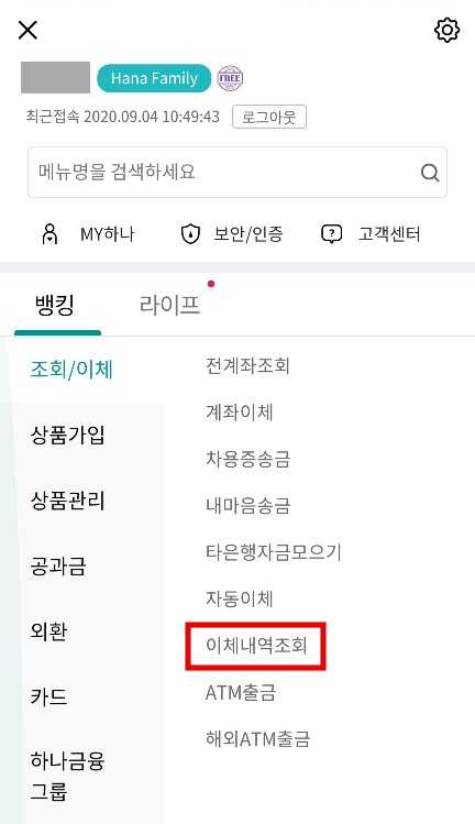 3. 아래 화면이 뜨면 <이체내역조회> 선택