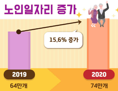 2020년 노인일자리는 전년 대비 15.6%나 증가하였습니다. 하지만 코로나19로 인해 많은 사업들이 취소되거나 참여를 못 하고 계실 것 같네요.